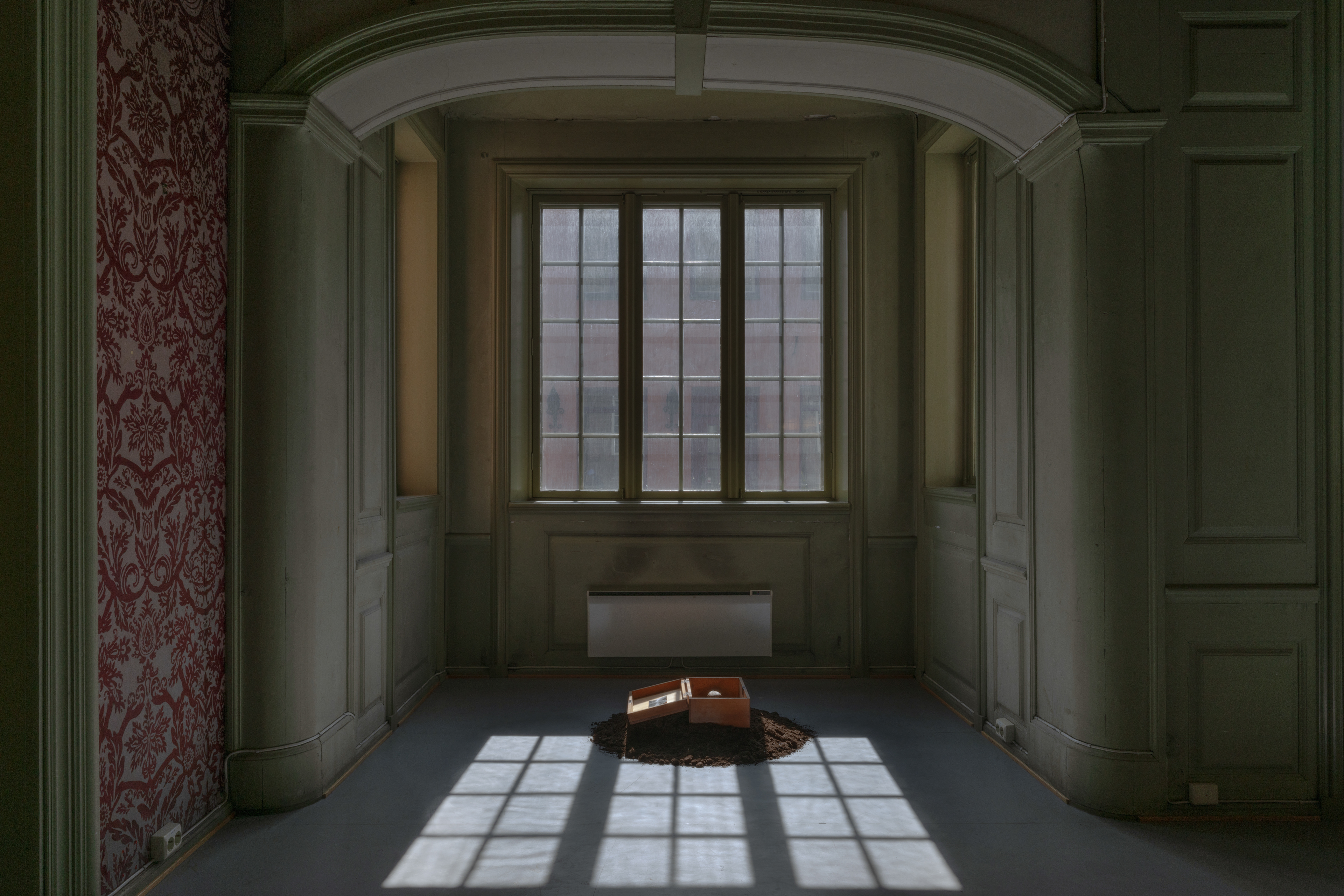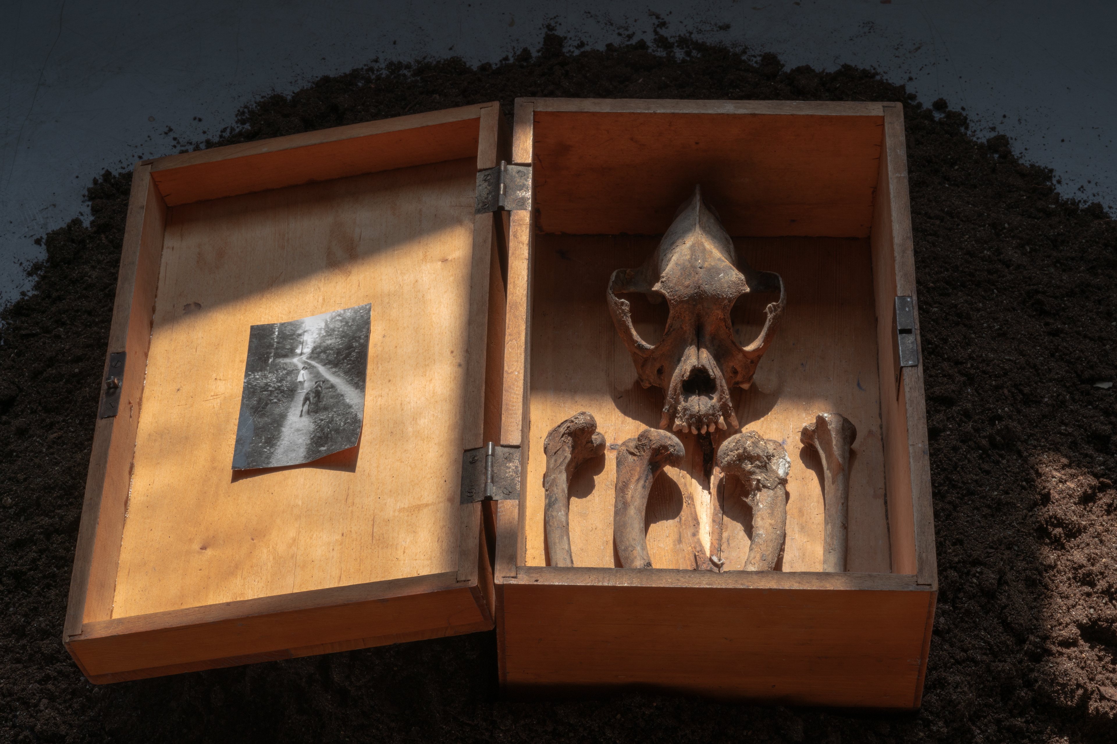 2020 A wooden box containing an old photograph of my mother and her childhood dog (Rita) and next to it the bones of the dog after being dug-up over 50 years later. The elements are placed on a dug-up pile of soil.